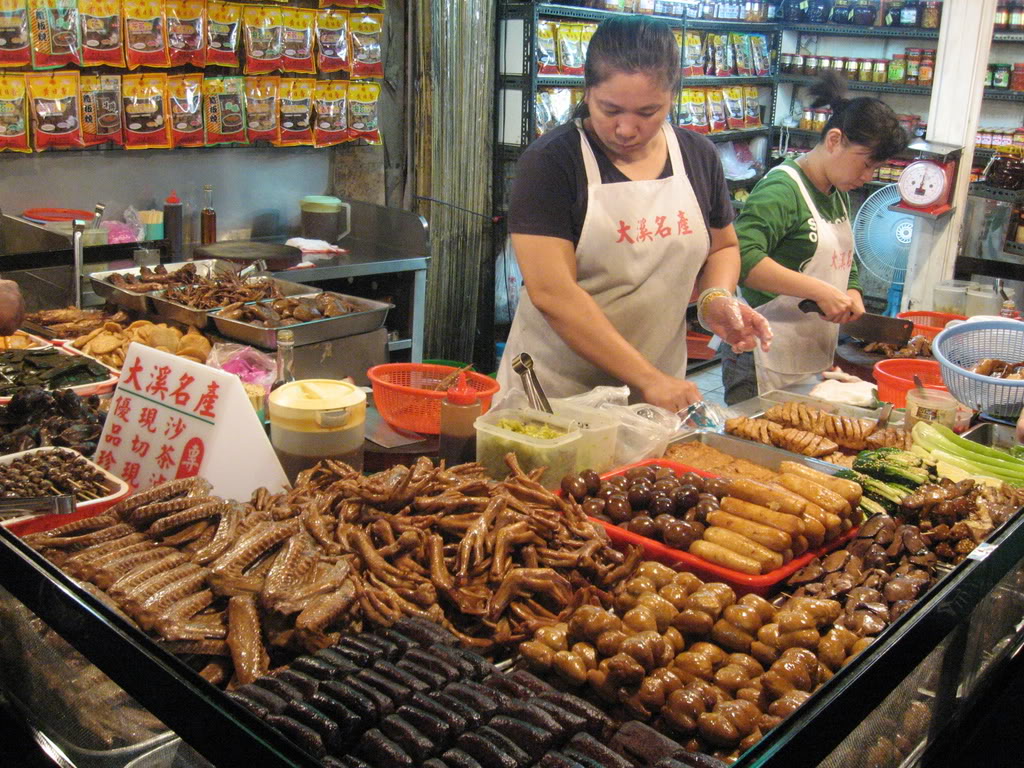 Shilin Night Market traces its roots back to a farmers’ market established in 1909 in the triangular area defined by Yang Ming Theater, Cixian Temple, and Jihe Road. Due to its proximity to a ferry terminal on the Keelung River, the area became a center for trading local agricultural goods, with much of the activity concentrated at the front court area of Cixian Temple on Danan Road. Over time, the market’s fortunes ebbed with the declining ferry traffic and the area evolved into a night market. In October 2002, the city government began dismantling the aging market facilities for sanitation reasons. All of the buildings were torn down, with the exception of a brick building dating back to the Japanese occupation period, and the stalls were relocated to a temporary building across from the MRT Jiantan Station. The new market, along with the jumble of shops on the adjacent streets, continues to be a major visitor magnet.