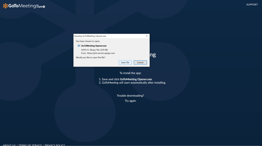 3. Click “Yes,” “Grant” hoặc “Trust” để tải và cài đặt ứng dụng GoToMeeting cho phép bạn truy cập vào sự kiện.