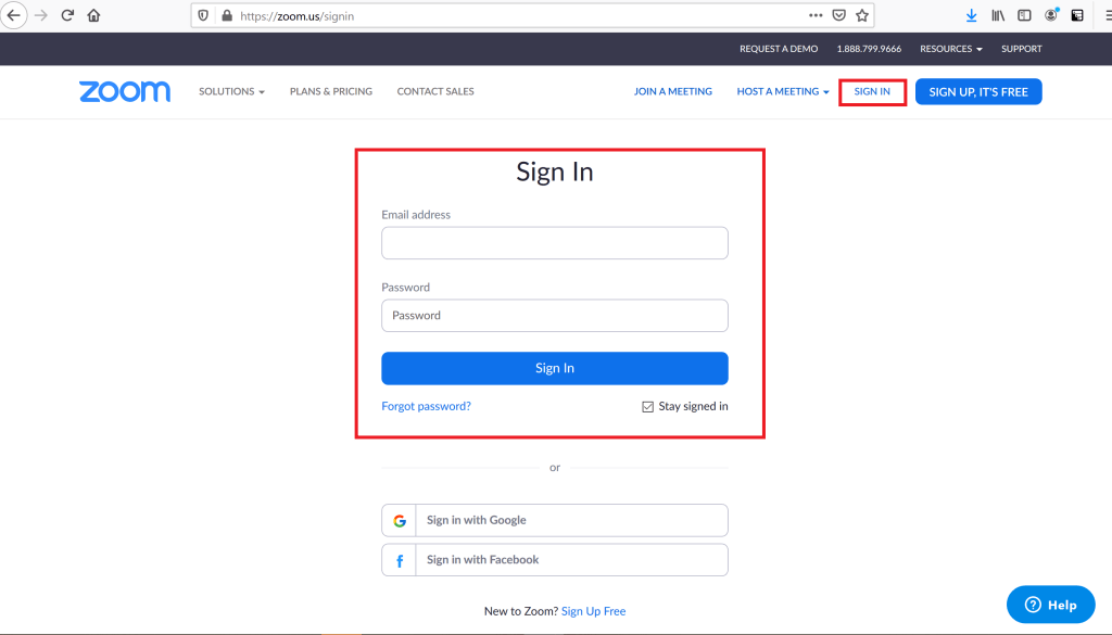 Ở phía bên phải góc trên của trang chủ, chọn SIGN IN. Sau đó điền thông tin tài khoản zoom đã tạo.